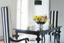 高椅背的椅子在空间里面异常突出,使空间极具威严的同时彰显气派。大黑白间条的布艺椅子,一下子敲定了空间的颜色大调,而无需其他调节主色调的多余装饰品,让空间异常干净整洁。