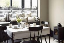 大方简单的杯具、洁净的桌布以及简洁的椅子和旁边古式的烤炉,使整个空间流露出简单古朴的感觉。布艺装饰则采用了各种宁静的田园风,毫不夸张的黑白搭配,使用餐空间的气氛清淡安详。