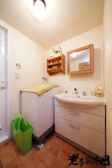 装饰Tips:淡橘色波点的壁纸,让甜美气息弥漫整个洗漱间。下方的拉式收纳柜,放置毛巾等,非常实用。木质边框的镜子,既实用又美观。
