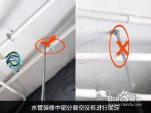 小编点评:从顶上走的水管,没有进行挂钩安装固定。因为水管如果从房屋顶上走,不安装固定关卡,水管使用久了,由于承重过久会向下挂下来,影响到顶部装修。