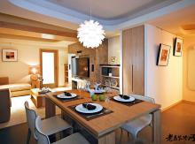 餐厅软装挑选与整体色调相符,白与黑的对比,在一派原木色中极显优雅高档。造型特异的灯具给餐厅增加了时尚气息。