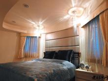主卧也非常简约,天花配合房间的走势打造椭圆造型,精选的灯饰让光影成为另一种形式的装饰。